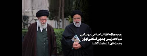 به گزارش روابط عمومی، حضرت آیت‌الله خامنه‌ای در پیامی شهادت حجت‌الاسلام والمسلمین سیّدابراهیم رئیسی رئیس‌جمهور اسلامی ایران، دکتر امیرعبداللهیان وزیر امور خارجه، حجت‌الاسلام‌والمسلمین آل‌هاشم نماینده ولی‌فقیه در آذربایجان شرقی، دکتر رحمتی استاندار آذربایجان شرقی و همراهان گرامی ایشان در سانحه هوایی را تسلیت گفتند.