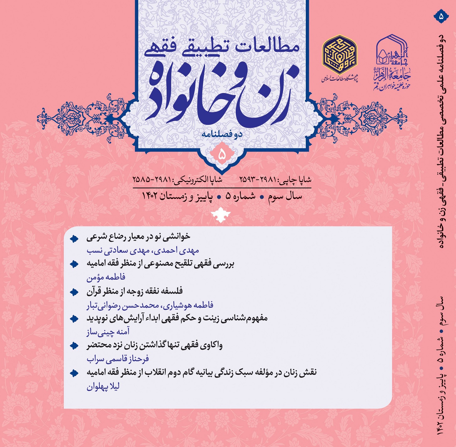 در این شماره مقالاتی با عناوین «خوانشی نو در معیار رضاع شرعی» تألیف مهدی احمدی، مهدی سعادتی نسب، «بررسی فقهی تلقیح مصنوعی از منظر فقه امامیه» به نگارش فاطمه مؤمن، «فلسفه نفقه زوجه از منظر قرآن» نوشته فاطمه هوشیاری، محمدحسن رضوانی تبار، «مفهوم شناسی زینت و حکم فقهی ابداء آرایشهای نوپدید» به کوشش آمنه چینیساز، «واکاوی فقهی تنها گذاشتن زنان نزد محتضر» تألیف فرحناز قاسمی سراب و «نقش زنان در مؤلفه سبک زندگی بیانیه گام دوم انقلاب از منظر فقه امامیه» نوشته لیلا پهوان منتشر شده است.