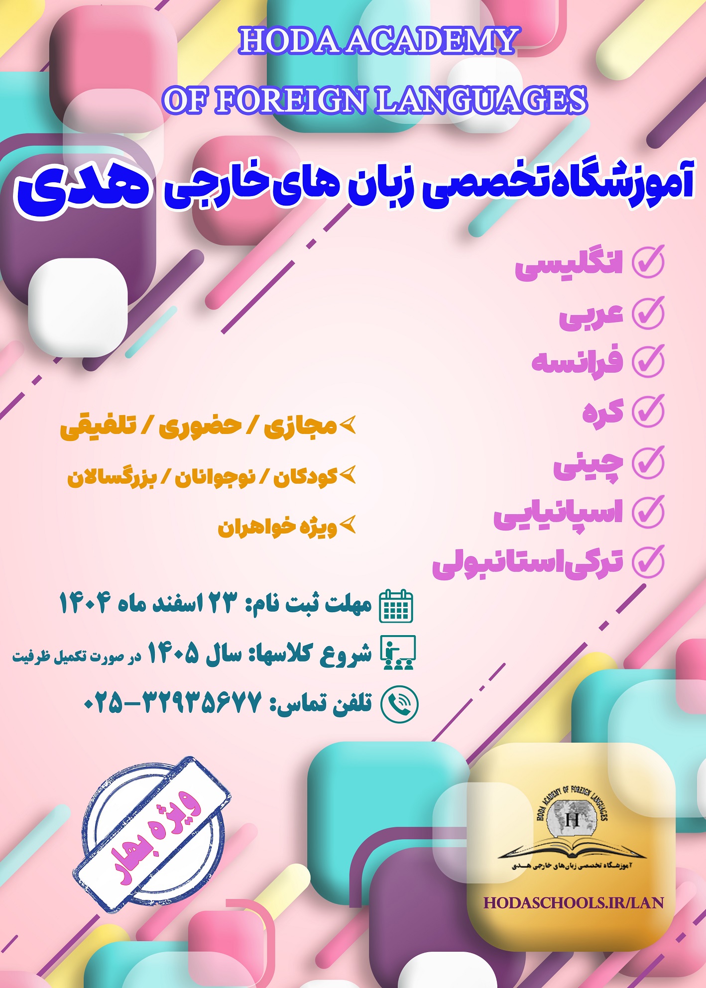 وی با بیان اینکه ثبت نام به صورت غیر حضوری انجام میشود، افزود: علاقه مندان جهت ثبت نام و کسب اطلاعات بیشتر می توانند به نشانی https://www.hodaschools.ir/lan/?app=content&catid=۰&itemid=۱ مراجعه نمایند.
